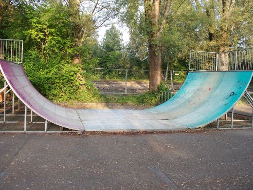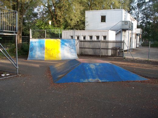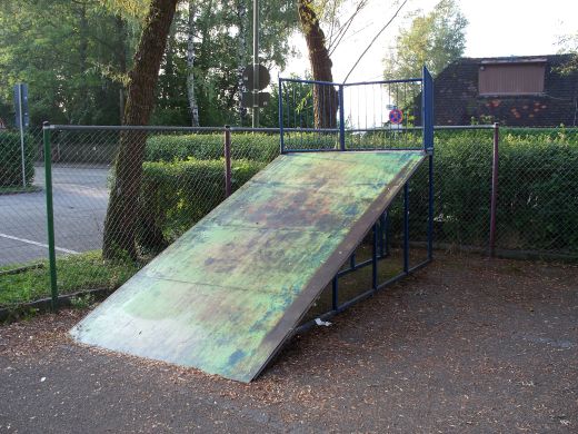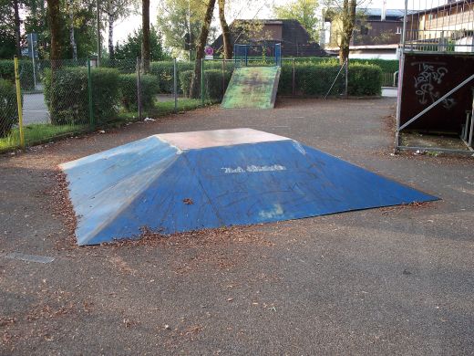 rechts ein Parkplatz, auf dessen hinterer Ecke der Skatepark ist